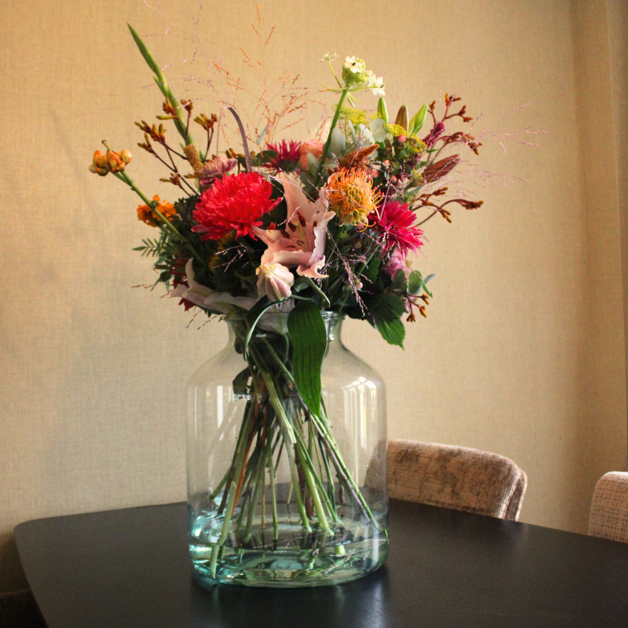 Geen standaard bloemetjes, maar een seizoensgebonden mix van bloemen met flair. Denk aan royale rozen, elegante lisianthus, eigenwijze gerbera’s en zelfs een paar opvallende seizoensknallers die je vaas spontaan in een feestje veranderen.